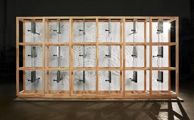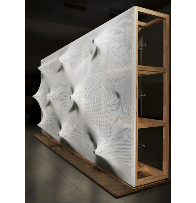 A superfície tem uma série de pontos motorizados em um tecido sintético elástico e translúcido que fazem movimentos de extensão e retração. O movimento controlado digitalmente cria uma coreografia interessante e constante desses “picos”, formando uma topografia diferente.