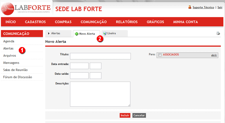 - Acesso Cadastro de Alertas menu Comunicação -> Alertas;
