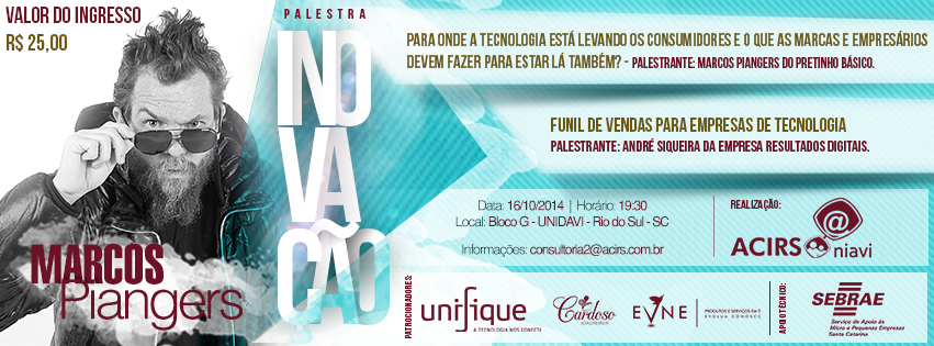 Com o tema “Inovação: Para onde a tecnologia está levando os consumidores e o que as marcas e empresários devem fazer para estar lá também”, Marcos Piangers se apresentará em Rio do Sul, no dia 16 de outubro.