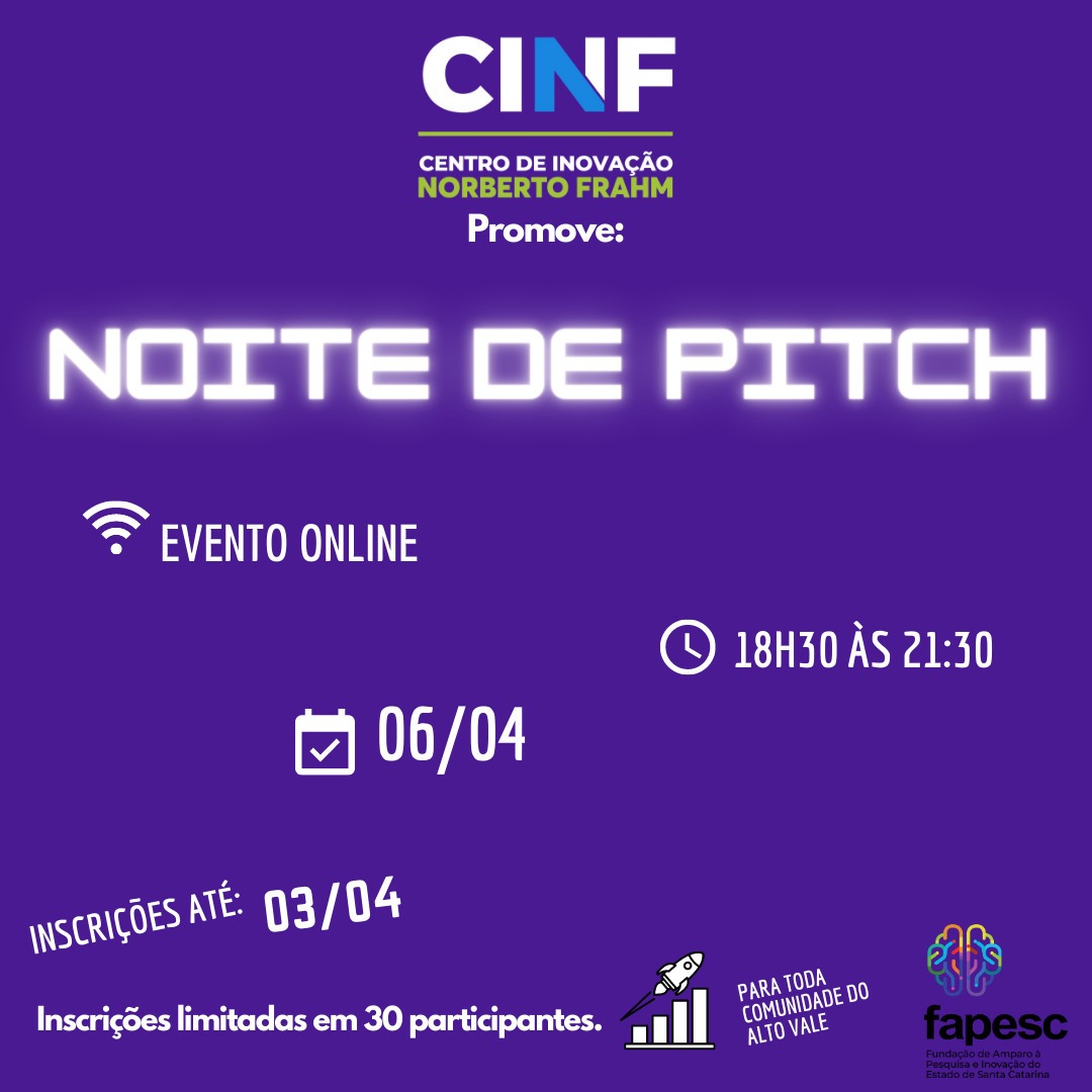 No dia 06/04/2021, às 18h30, acontece a noite de pitch do CINF.