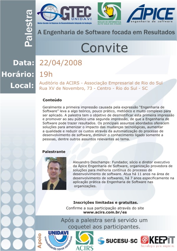 Acontece terça dia 22/04 as 19h a Palestra “Engenharia de Software focada em Resultados”, promovida em parceria pelo GTEC-UNIDAVI, NIAVI-ACIRS e Ápice de Blumenau.