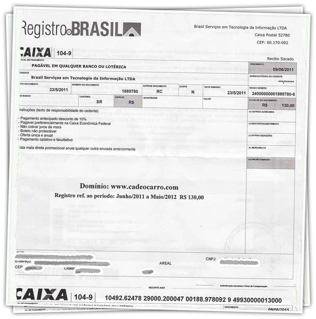 Eles repassam boletos (como o da imagem abaixo) e solicitam o pagamento de R$ 130,00 referente à um domínio que não é seu. A fraude ocorre pois onde eles emitem o domínio o endereço não é correto.